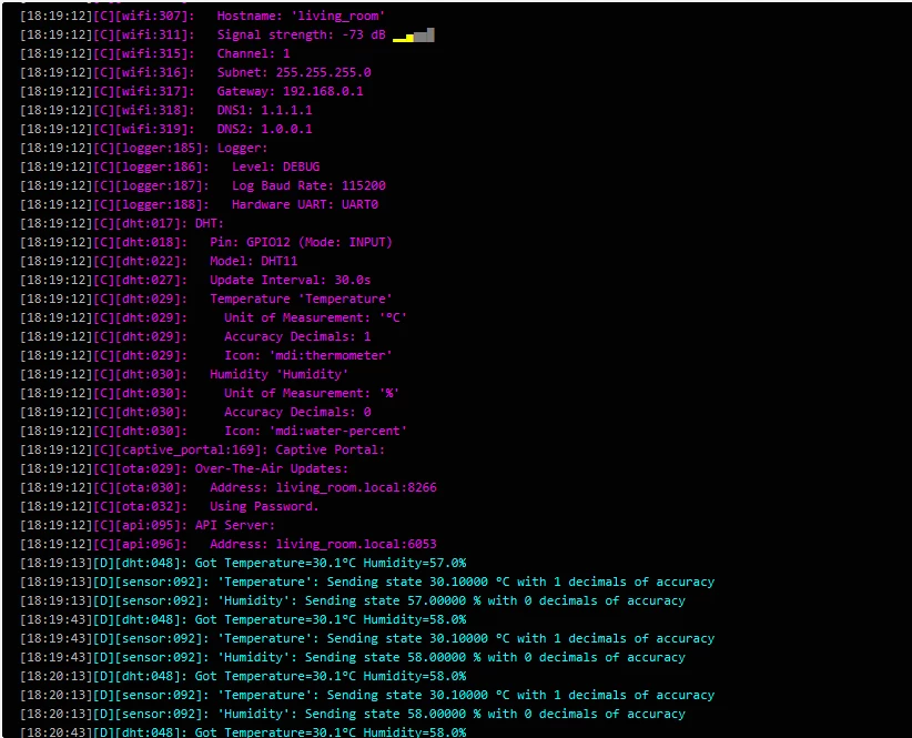 Click on Save. Upload to upload the binary via OTA Update. After validation, compilation and Uploading, ESP8266 will reboot itself and transmitting data to Home Assistant securely over APIs. Click on Log to see the data being sent from ESP8266 to the Home Assistant.