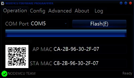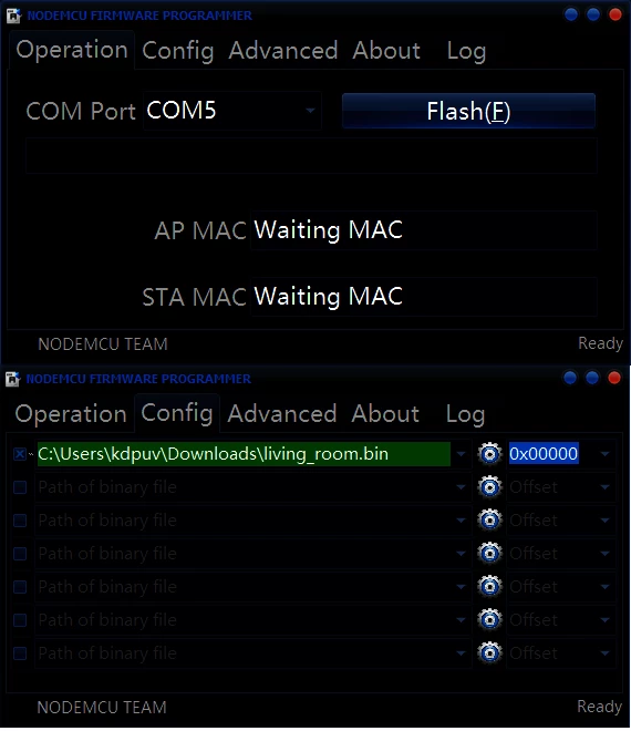 Now, Click on Menu and compile. After the compilation completed click on Download to save the binary. To flash the binary to the NodeMCU, Download NodeMCU Flasher. Open NodeMCU Flasher. Select COM port and binary file to flash in Config tab.